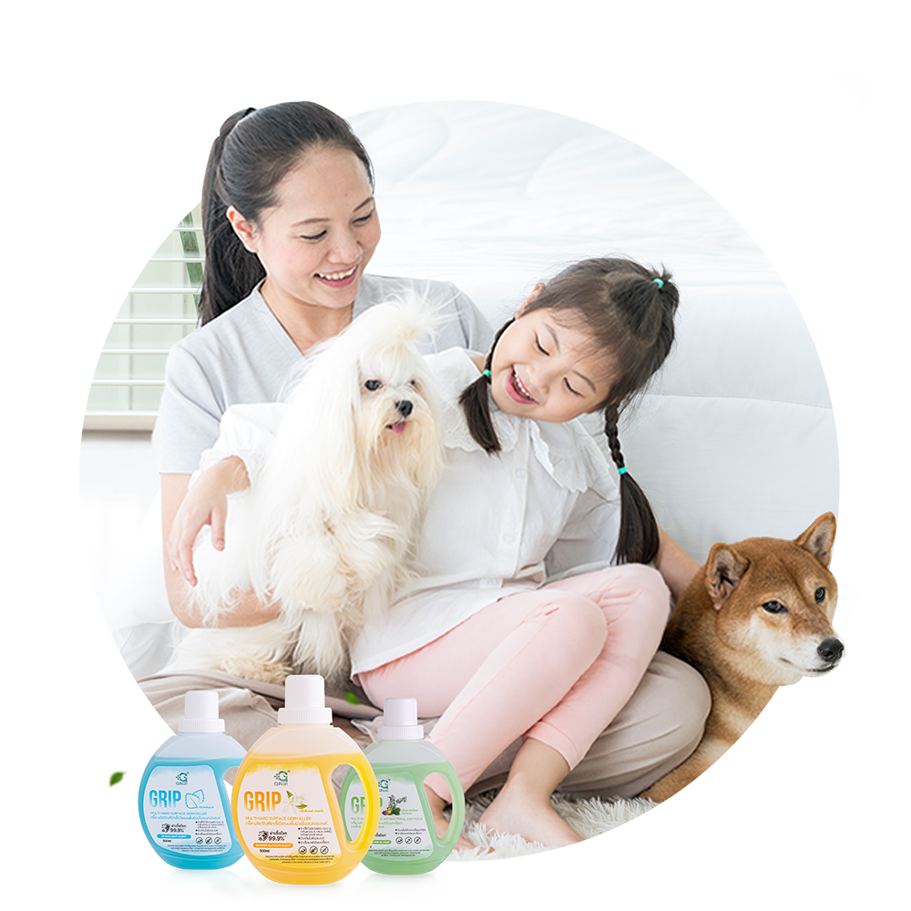 GRIP มีจุดเริ่มต้นมาจากการทำความสะอาดฆ่าเชื้อบนพื้น เมื่อบ้านมีน้องหมาแสนรู้ พันธุ์อิงลิชบลูด็อก ชื่อ “ชาตรี” ซึ่งชาตรีมีปัญหาการระคายเคืองผิวหนัง มีผดแดงขึ้นบริเวณใต้ท้อง มาจากการใช้น้ำยาฆ่าเชื้อทั่วไปบนผิวหนังที่บอบบาง จึงเกิดอาการแพ้ ระคายเคือง ทั้งในเวลาเดียวกัน ก็มีลูกเล็กในบ้าน
